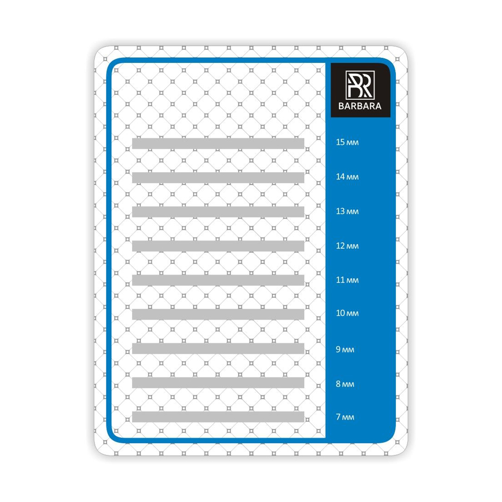 Планшет для ресниц Barbara выполнен из качественного акрила. На планшет нанесена разметка с указанием длины ресниц от 7 до 15 мм, что позволяет легко расположить длины ресниц в нужном порядке. Благодаря светлому фону планшета на нем очень удобно формировать пучки ресниц и снимать ресницы с ленты.